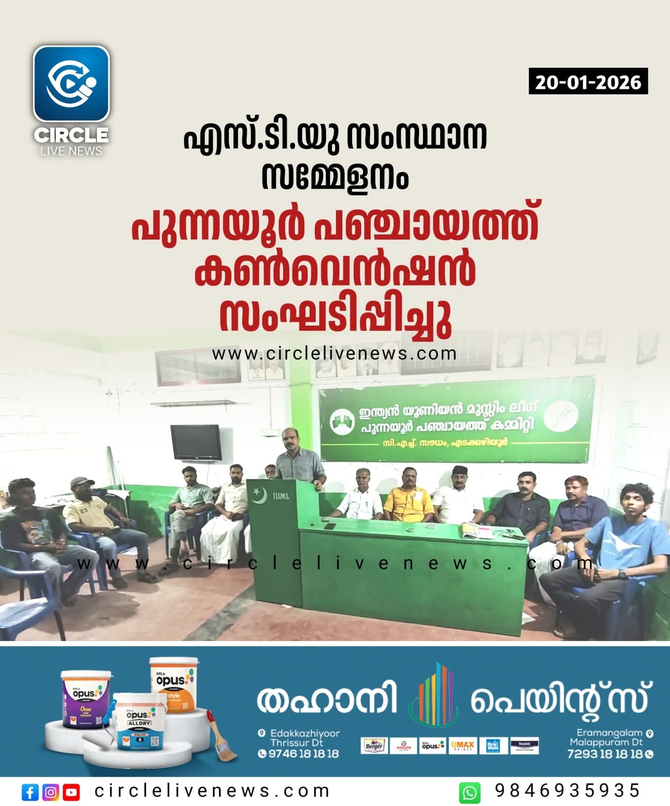 പുന്നയൂർ: ഫെബ്രുവരി 1,2 തിയ്യതികളിൽ കോഴിക്കോട് നടക്കുന്ന എസ്.ടി.യു സംസ്ഥാന സമ്മേളനം വിജയിപ്പിക്കുന്നതിനാവശ്യമായ പ്രവർത്തനങ്ങൾക്ക് രൂപം നൽകാൻ എസ്.ടി.യു പുന്നയൂർ പഞ്ചായത്ത് കൺവെൻഷൻ സംഘടിപ്പിച്ചു. മുസ്ലിം ലീഗ് പുന്നയൂർ പഞ്ചായത്ത് പ്രസിഡന്റ് പി.എ നസീർ ഉദ്ഘാടനം ചെയ്തു. മത്സ്യ തൊഴിലാളി ഫെഡറേഷൻ എസ്.ടി.യു സംസ്ഥാന സെക്രട്ടറി ഹംസകുട്ടി മന്ദലാംകുന്ന് അധ്യക്ഷത വഹിച്ചു.ന്യൂസ് പേപ്പർ ഏജന്റ്സ് ആൻ്റ് വിതരണ തൊഴിലാളി യൂണിയൻ എസ്.ടി.യു സംസ്ഥാന സെക്രട്ടറി അസീസ് മന്ദലാംകുന്ന്, മുട്ടിൽ ഖാലിദ്, ജലീൽ കാര്യാടത്ത്, ജിൻഷാദ് തേച്ചൻ, ഉസ്മാൻ മൂന്നയിനി എന്നിവർ സംസാരിച്ചു. എസ്.ടി.യു ഗുരുവായൂർ നിയോജക മണ്ഡലം ജനറൽ സെക്രട്ടറി അബ്ദുൽ സലീം കുന്നമ്പത്ത് സ്വാഗതവും മോട്ടോർ ആൻ്റ് എൻജിനിയറിങ്ങ് വർക്കേഴ്സ് യൂണിയൻ ഗുരുവായൂർ നിയോജക മണ്ഡലം വൈസ് പ്രസിഡന്റ് വി.എം റഹീം നന്ദിയും പറഞ്ഞു.