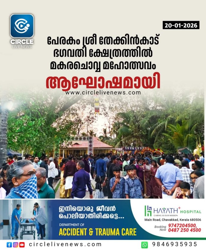 ചാവക്കാട്: പേരകം ശ്രീ തേക്കിൻകാട് ഭഗവതി ക്ഷേത്രത്തിൽ മകരചൊവ്വ മഹോത്സവം ഭക്തിസാന്ദ്രമായി. ഉത്സവത്തിന് മുൻപായി 40 ദിവസത്തെ ചുറ്റുവിളക്കുകൾ അരങ്ങേറി. ഇന്ന് പുലർച്ചെ മൂന്നിന് നിർമ്മാല്യ ദർശനം, നാലിന് വാകചാർത്ത്, 4.30 ന് കേളി, അഞ്ചിന് ഉഷ പൂജ, 7 മുതൽ 11 വരെ വെച്ചു നിവേദ്യം, 11 മുതൽ 12 വരെ ഉച്ചപൂജ എന്നീ വിവിധ ചടങ്ങുകൾ നടന്നു. ഉച്ചക്ക് ഒന്നിന് പഞ്ച വദ്യത്തോടുകൂടി എഴുന്നള്ളിപ്പ് ഉണ്ടായി. രണ്ടിന് പേരകം ശിവ ക്ഷേത്രത്തിൽ നിന്ന് വിവിധ കമ്മറ്റികളുടെ എഴുന്നള്ളിപ്പ് പുറപ്പെട്ട് 5.30 ന് ക്ഷേത്രനടയിൽ പ്രവേശിച്ചു. 6.30 ന് ദീപാരാധന, ഏഴിന് നടക്കൽ പറ, പുലർച്ചെ ഗുരുതി തർപ്പണത്തോടു കൂടി ചടങ്ങുകൾ അവസാനിച്ചു. പ്രസിഡണ്ട് ബേബി കരിപ്പോട്ട്, വൈസ് പ്രസിഡണ്ട് സോമൻ കടാങ്കര, സെക്രട്ടറി ശശി ആനക്കോട്ടിൽ, ട്രഷറർ സുകുമാരൻ എരിഞ്ഞിയിൽ, വി.എസ് ചന്ദ്രൻ, പി.ബി ബാബു, എം.കെ രാജ, കെ.വി ദാസൻ, സി.എസ് ഗിരീഷ്, എ വേലായുധ കുമാർ എന്നിവർ നേതൃത്വം നൽകി.