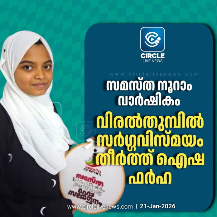 ചാവക്കാട്: വിവിധ നിറങ്ങളുള്ള നൂലുകൾ സൂചിയിൽ കോർത്ത് സമസ്തയുടെ നൂറാം വാർഷിക ലോഗോ നിർമ്മിച്ച് വിസ്മയം തീർത്ത് ഐഷ ഫർഹ. തിരുവത്ര വാദി നൂർ മദ്റസയിലെ എഴാം ക്ലാസ് വിദ്യാർത്ഥിനിയാണ് ഐഷ ഫർഹ. സമസ്ത കേരള ജംഇയത്തുൽ ഉലമയുടെ നൂറാം വാർഷിക പ്രചരണം നടക്കവേയാണ് മദ്റസയിൽ ഒട്ടിച്ച പോസ്റ്ററിലെ ലോഗോ ഐഷയുടെ ശ്രദ്ധയിൽപ്പെട്ടത്. ഇതോടെ ലോഗോ തന്റെ വിരൽ തുമ്പുകൊണ്ട് നെയ്തെടുത്താലോ എന്ന ചിന്തയുദിച്ചു. ഐഷ ഫർഹയുടെ ആഗ്രഹം സഫലീകരിക്കാൻ മദ്റസയിലെ മിർ കാസിം ഉസ്താദ് പൂർണ്ണ പിന്തുണയുമായി എത്തിയതോടെ