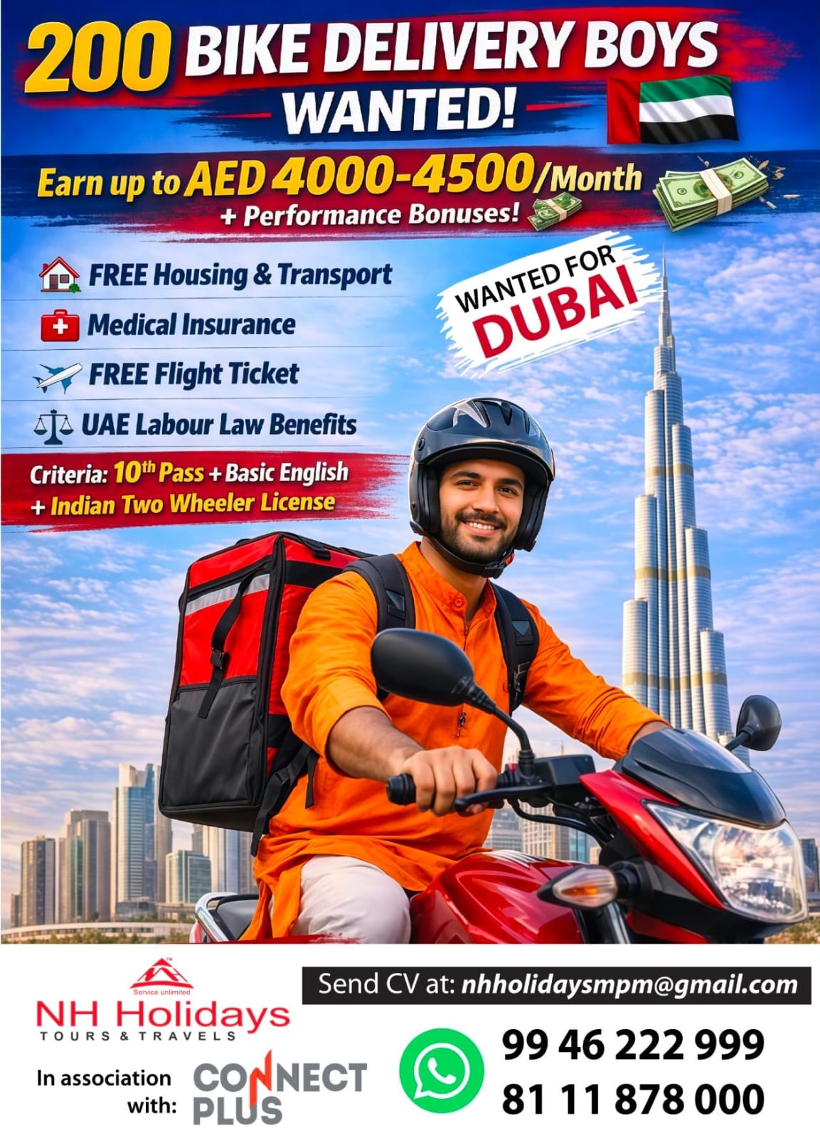 ദുബായിലേക്ക് 200 ബൈക്ക് ഡെലിവറി ബോയ്സിനെ ആവശ്യമുണ്ട്