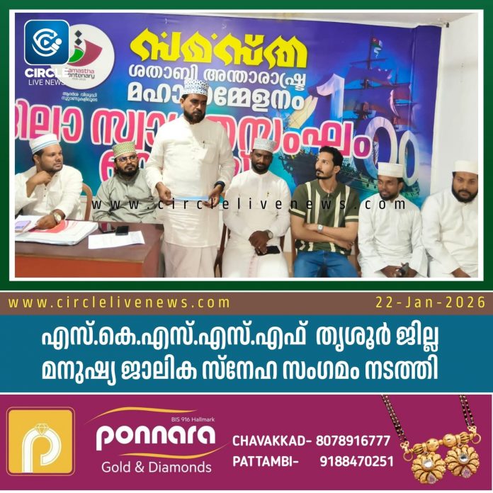 ചാവക്കാട്: രാഷ്ട്ര രക്ഷക്ക് സൗഹൃദത്തിന്റെ കരുതൽ എന്ന പ്രമേയത്തിൽ എസ്.കെ.എസ്.എസ്.എഫ് തൃശൂർ ജില്ല മനുഷ്യ ജാലികയുടെ പ്രചരണാർത്ഥം ചാവക്കാട് മേഖല തല സംഗമം നടത്തി. എസ്.കെ.എസ്.എസ്.എഫ് ത്വലബ വിങ് സംസ്ഥാന ചെയർമാൻ സത്താർ ദാരിമി ഉദ്ഘാടനം ചെയ്തു. എസ്.കെ.എസ്.എസ്.എഫ് ജില്ല ട്രഷറർ ഷാഹുൽ ഹമീദ് റഹ്മാനി മുഖ്യ പ്രഭാഷണം നടത്തി. ചാവക്കാട്, വടക്കേകാട്, ഗുരുവായൂർ മേഖല ഭാരവാഹികളായ സ്വാബിർ യമാനി, നിയാസ് പൈങ്കണ്ണിയൂർ, ഉസ്മാൻ ദാരിമി, സയ്യിദ് സയ്യിദ് ഫാദിൽ തങ്ങൾ, എസ്.കെ.എസ്.എസ്.എസ്. എഫ് ഖത്തർ തൃശൂർ ജില്ല സെക്രട്ടറി റഷാദ് എടക്കഴിയൂർ, വിഖായ ഏക്റ്റീവ് അംഗം ഷുഐബ് കടപ്പുറം, റിയാഫ് പണ്ടറക്കാട്, ഷാഫി ബ്രഹ്മകുളം, ഇദിരീസ് വെന്മേനാട്, സഈദ് ബാഖവി, ഷഹീർ മുനക്കകടവ് എന്നിവർ പങ്കെടുത്തു.
