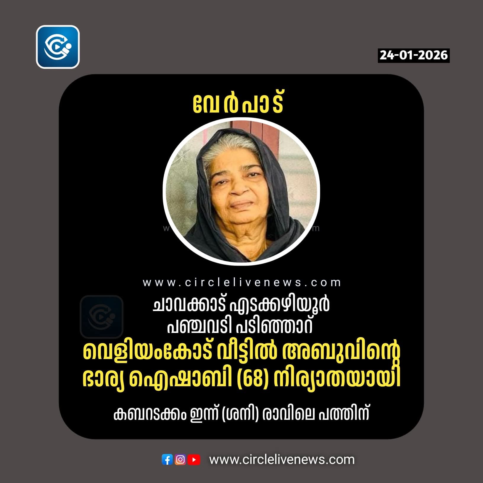 ചാവക്കാട് എടക്കഴിയൂർ പഞ്ചവടി പടിഞ്ഞാറ് വെളിയംകോട് വീട്ടിൽ അബുവിൻ്റെ ഭാര്യ ഐഷാബി (68) നിര്യാതയായി
