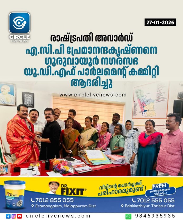 ഗുരുവായൂർ: രാഷ്ട്രപതി അവാർഡ് നേടിയ ഗുരുവായൂർ എ.സി.പി സി പ്രേമാനന്ദകൃഷ്ണനെ ഗുരുവായൂർ നഗരസഭ യു.ഡി.എഫ് പാർലമെന്റ് കമ്മിറ്റി ആദരിച്ചു. യു.ഡി.എഫ് പാർലിമെന്ററി പാർട്ടി ലീഡർ ബഷീർ പൂക്കോട് അധ്യക്ഷത വഹിച്ചു. കൗൺസിലർമാരായ ജോയ് ചെറിയാൻ, ജലീൽ പണിക്കവീട്ടിൽ, എ.എം മെഹ്റൂഫ്, വി.എസ് നവനീത്, എം.വി ബിജു, വി.എസ് അഷ്ഫാക്ക്, എ.വി ഉണ്ണികൃഷ്ണൻ, പ്രിയാ രാജേന്ദ്രൻ, സുഷ ബാബു, ഷീന റാഫേൽ, ചന്ദ്ര രാമകൃഷ്ണൻ, പി.കെ മഹിജ തുടങ്ങിയവർ പങ്കെടുത്തു.