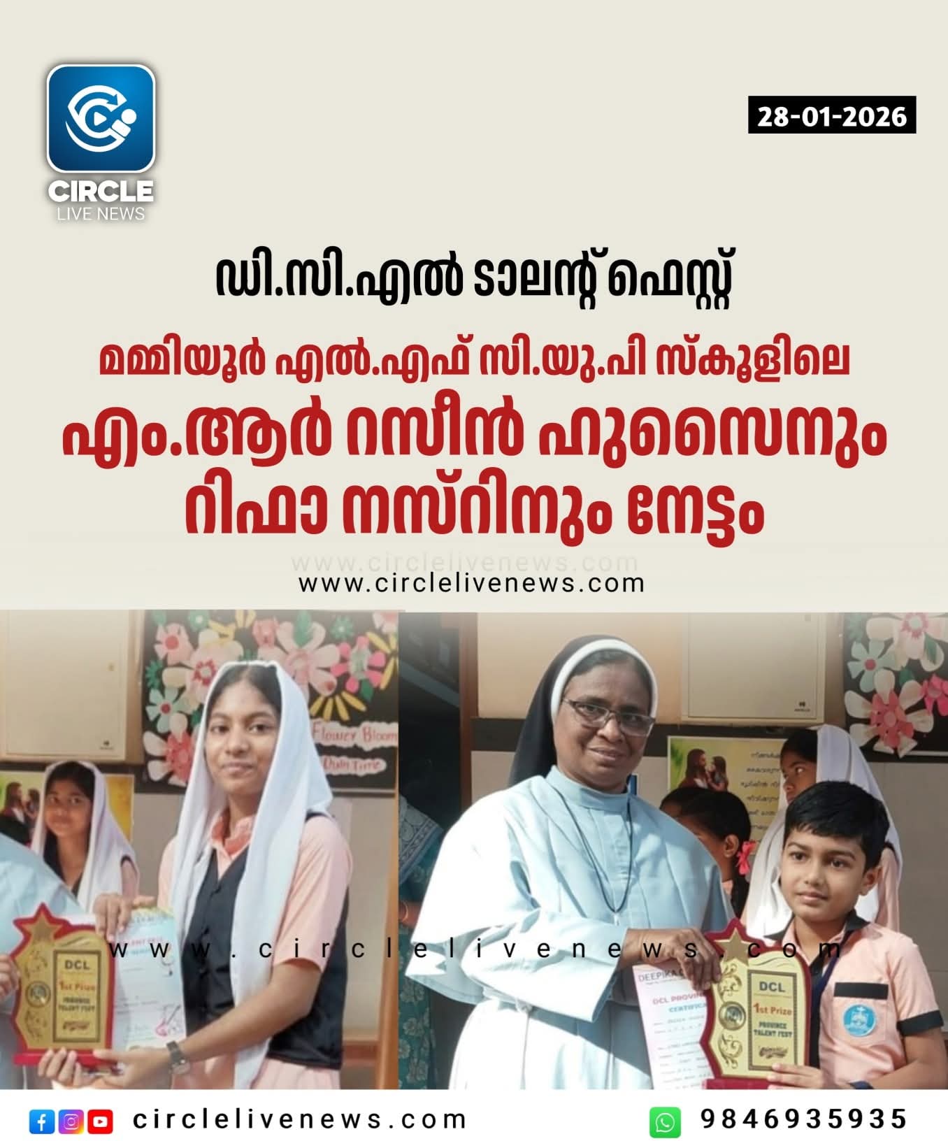 ചാവക്കാട്: ദീപിക ചിൽഡ്രൻസ് ലീഗ് സംഘടിപ്പിച്ച ഡി.സി.എൽ ടാലന്റ് ഫെസ്റ്റ് 2026ൽ എം.ആർ റസീൻ ഹുസൈനും റിഫാ നസ്റിനും നേട്ടം. മൂവാറ്റുപുഴയിൽ നടന്ന സംസ്ഥാന തല മത്സരത്തിൽ എൽ.പി വിഭാഗം കഥാരചനയിൽ എം.ആർ റസീൻ ഹുസൈൻ എ ഗ്രേഡോട് കൂടി രണ്ടാം സ്ഥാനവും യു.പി വിഭാഗം കവിതാ രചനയിൽ റിഫാ നസ്റിൻ എ ഗ്രേഡോട് കൂടി തന്നെ രണ്ടാം സ്ഥാനവും കരസ്ഥമാക്കി. മമ്മിയൂർ എൽ.എഫ് സി.യു.പി സ്കൂളിലെ വിദ്യാർത്ഥികളാണ് ഇരുവരും. തിരുവനന്തപുരം മുതൽ കാസർഗോഡ് വരെയുള്ള ജില്ലകളിൽ നിന്നും ഒന്ന് രണ്ട് സ്ഥാനങ്ങളും എ ഗ്രേഡും നേടിയവരാണ് സംസ്ഥാനതലത്തിൽ മത്സരിച്ചത്. ബ്രഹ്മകുളത്ത് വച്ച് നടന്ന ഉപജില്ലാ മത്സരത്തിലും തൃശൂർ മണ്ണുത്തിയിൽ വച്ച് നടന്ന ജില്ലാതല മത്സരത്തിലും റസീൻ ഹുസൈൻ കഥാരചനയിലും റിഫാ നസ്റിൻ കവിത രചനയിലും എ ഗ്രേഡോടെ ഒന്നാം സ്ഥാനം കരസ്ഥമാക്കിയിരുന്നു.