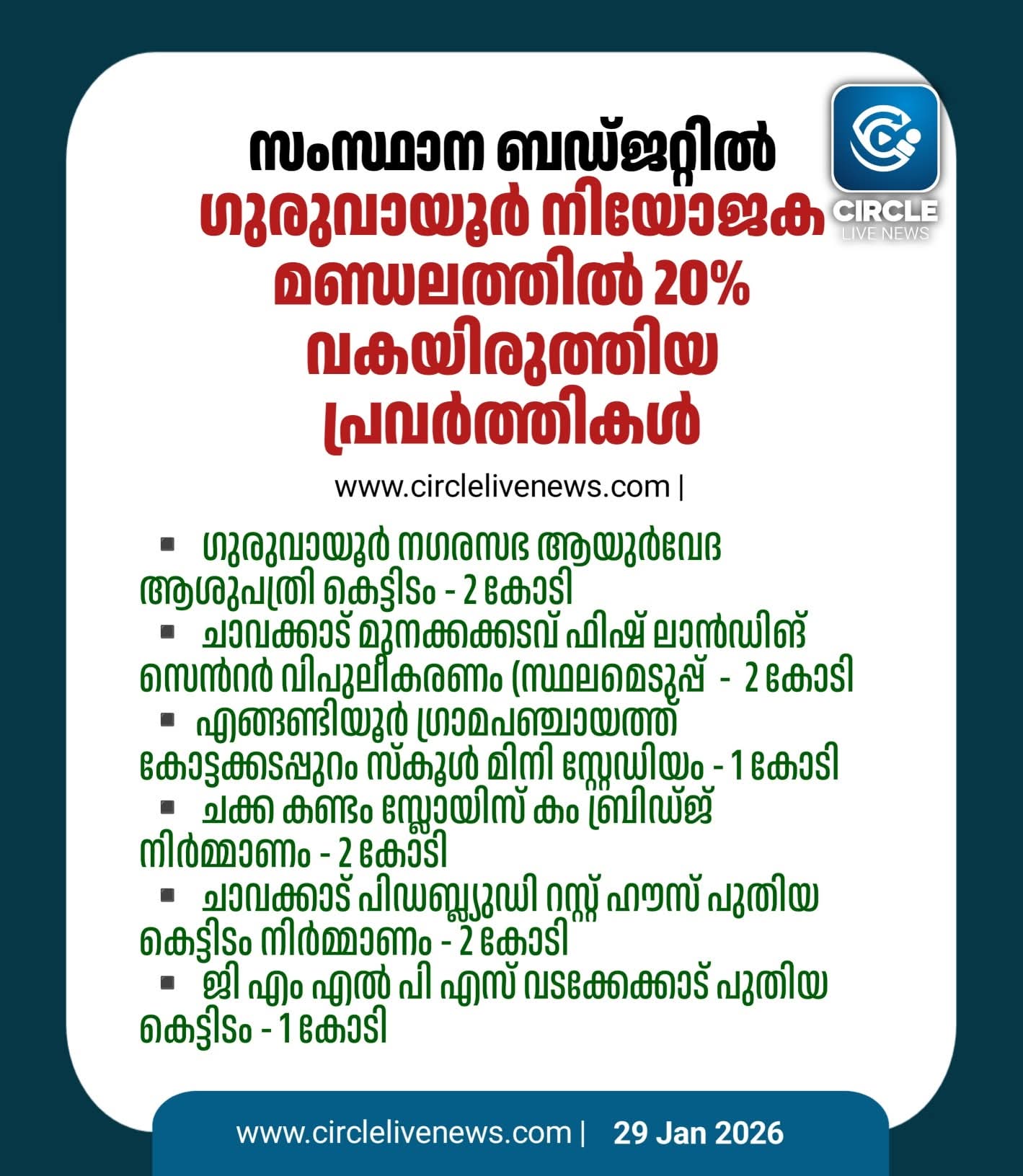 സംസ്ഥന ബജറ്റ്; ഗുരുവായൂർ നിയോജക മണ്ഡലത്തിൽ 20% വകയിരുത്തിയ പ്രവർത്തികൾ