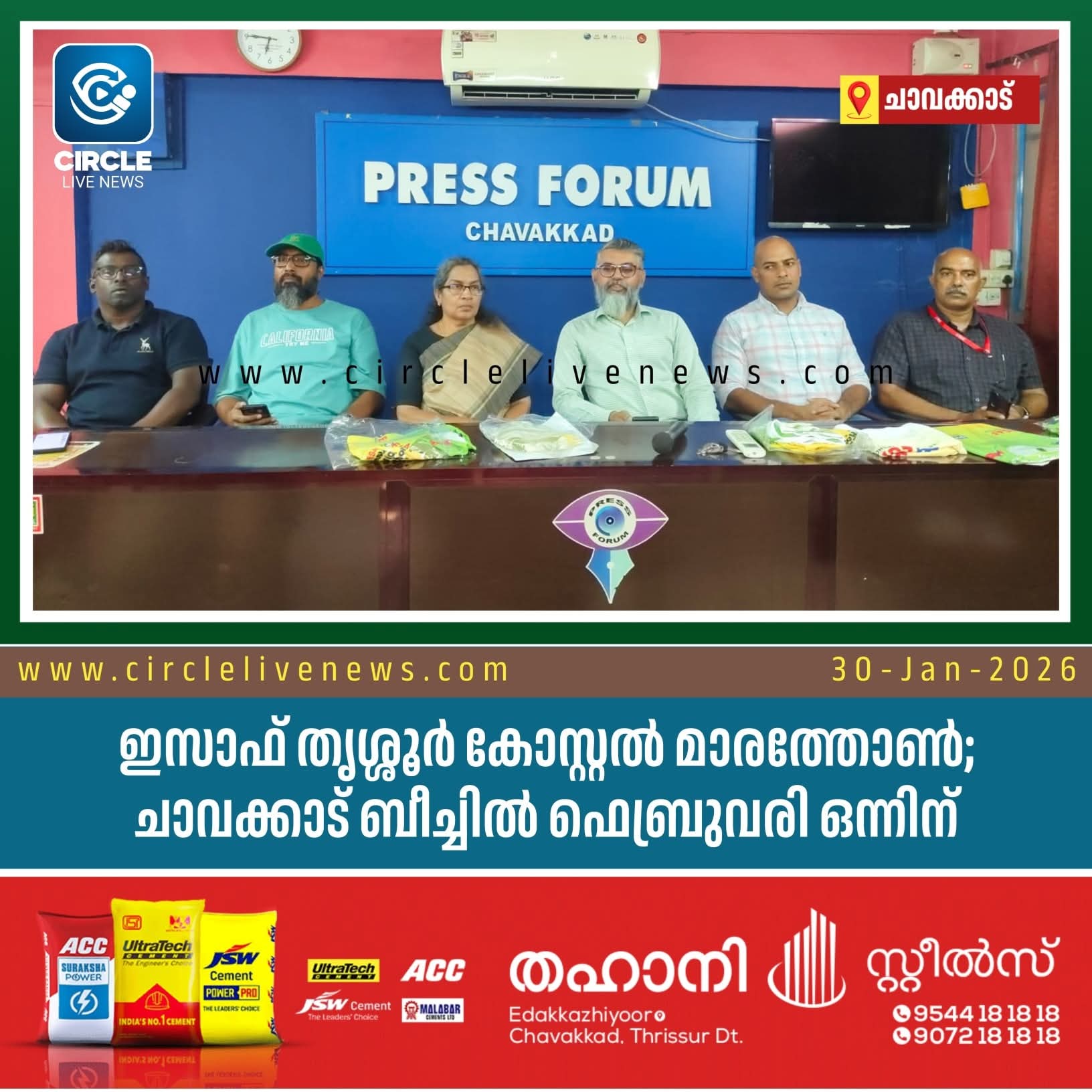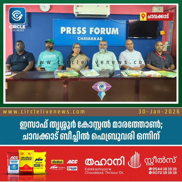 ചാവക്കാട്: ഇസാഫ് തൃശ്ശൂർ കോസ്റ്റൽ മാരത്തോൺ ഫെബ്രുവരി ഒന്നിന് ചാവക്കാട് ബീച്ചിൽ സംഘടിപ്പിക്കുമെന്ന് ഭാരവാഹികൾ വാർത്ത സമ്മേളനത്തിൽ അറിയിച്ചു. തൃശ്ശൂർ ജില്ലയിലെ ഏക കോസ്റ്റൽ മാരത്തോൺ എന്ന സവിശേഷതയുള്ള ഈ മത്സരത്തിൽ ഇന്ത്യയുടെ വിവിധ ഭാഗങ്ങളിൽ നിന്നായി 650ൽ പരം കായികതാരങ്ങൾ പങ്കെടുക്കും. 21.1 കിലോമീറ്റർ ഹാഫ് മാരത്തോൺ, 10 കിലോമീറ്റർ, 5 കിലോ മീറ്റർ ഫാമിലി ഫൺ റൺ എന്നീ മത്സരങ്ങളാണ് സംഘടിപ്പിക്കുന്നത്കായികക്ഷമത പ്രോത്സാഹിപ്പിക്കുന്നതിനൊപ്പം തീരദേശ ടൂറിസത്തെ ലോകത്തിന് മുന്നിൽ പരിചയപ്പെടുത്തുക എന്നതും ഇതിന്റെ പ്രധാന ലക്ഷ്യമാണ്. ലഹരിക്കെതിരെയും കൂടാതെ ആരോഗ്യപരമായ ജീവിതത്തിലേക്ക് ജനങ്ങളെയും പുതു തലമുറയെയും കൈപിടിച്ച് നടത്താനുള്ള ശ്രമമാണ് പരിപാടിയിലൂടെ സംഘടിപ്പിക്കുന്നത്. ചാവക്കാട് സൈക്ലിങ് ക്ലബ്ബും ഇസാഫ് ബാങ്ക് ആൻഡ് ഇസാഫ് ഫൗണ്ടേഷൻ സംയുക്തമായി നടത്തുന്ന ഈ കായിക മാമാങ്കം ഞായറാഴ്ച പുലർച്ചെ 5.30 ന് 21 കിലോമീറ്റർ ഹാഫ് മാരത്തോൻ ജില്ല കളക്ടർ അർജുൻ പാണ്ഡ്യൻ ഫ്ലാഗ് ഓഫ് ചെയ്യും. തുടർന്ന് 6.30 ന് 10 കിലോമീറ്റർ ഇസാഫ് ബാങ്ക് എംഡി ആൻഡ് സി.ഇ.ഒ പോൾ തോമസ് ഫ്ലാഗ് ഓഫ് നിർവഹിക്കും. ശേഷം ഏഴിന് 5 കിലോമീറ്റർ ഫാമിലി ഫൺ റൺ ഗുരുവായൂർ എ. സി.പി പ്രേമാനന്ദൻ ഫ്ലാഗ് ഓഫ് ചെയ്യും.