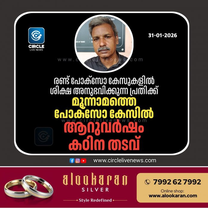 ചാവക്കാട്: രണ്ട് പോക്സോ കേസുകളിൽ ശിക്ഷ അനുഭവിച്ചുകൊണ്ടിരിക്കുന്ന പ്രതിക്ക് മൂന്നാമത്തെ പോക്സോ കേസിൽ ആറുവർഷം കഠിന തടവ്. ചാവക്കാട് ഒരുമനയൂർ മുത്തമ്മാവ് മാങ്ങാടി വീട്ടിൽ സജീവനേ(52)യാണ് ചാവക്കാട് അതിവേഗ സ്പെഷ്യൽ കോടതി കുറ്റക്കാരനാണെന്ന് കണ്ടെത്തി 6 വർഷം കഠിന തടവിനും 40,000 രൂപ പിഴ അടക്കാനും ശിക്ഷ വിധിച്ചത്. പിഴ അടക്കാത്ത പക്ഷം 4 മാസം കൂടി അധിക തടവ് അനുഭവിക്കണം. പിഴസംഖ്യ അതിജീവിതക്ക് നൽകാനും കോടതി ഉത്തരവായി. 12കാരനെ ഫോണിൽ അശ്ലീല വീഡിയോ കാണിച്ച് ലൈംഗികാതിക്രമം നടത്തിയ കേസിലാണ് ചാവക്കാട് ഫാസ്റ്റ് ട്രാക്ക് സ്പെഷ്യൽ കോടതി ശിക്ഷ വിധിച്ചത്. 2023 ജൂൺ മാസത്തിലാണ് കേസിനാസ്പദമായ സംഭവം. സർക്കിൾ ലൈവ് ന്യൂസ് അപ്ഡേറ്റ്. ചാവക്കാട് പോലീസ് സ്റ്റേഷനിലെ സീനിയർ സി.പി.ഒ ഷൗജത്ത് കുട്ടിയുടെ മൊഴി രേഖപ്പെടുത്തി ഹാജരാക്കിയതിന്റെ അടിസ്ഥാനത്തിൽ എസ്.ഐ പി.എസ് അനിൽ കുമാർ എഫ്.ഐ.ആർ രജിസ്റ്റർ ചെയ്തു. തുടർന്ന് എസ്.ഐ സെസിൽ ക്രിസ്ത്യൻ രാജാണ് കേസിന്റ അന്വേഷണം പൂർത്തിയാക്കി പ്രതിക്കെതിരെ കോടതിയിൽ കുറ്റപത്രം സമർപ്പിച്ചത്. പ്രോസിക്യൂഷനു വേണ്ടി 12 സാക്ഷികളെ വിസ്തരിക്കുകയും ശാസ്ത്രീയ തെളിവുകൾ ഉൾപ്പെടെ 18 രേഖകൾ ഹാജരാക്കുകയും ചെയ്തു. കുട്ടിയുടെ ഇളയ സഹോദരനേയും കൂട്ടുകാരനെയും ലൈംഗിക പീഡനത്തിന് വിധേയനാക്കിയതിന് 130 വർഷവും 110 വർഷവും രണ്ടു കേസുകളിൽ ആയി ഇതേ കോടതിയിൽ നിന്ന് വിധിച്ച ശിക്ഷ അനുഭവിച്ചു വരികയാണ് പ്രതി. പ്രോസിക്യൂഷനു വേണ്ടി സ്പെഷ്യൽ പബ്ലിക് പ്രോസിക്യൂട്ടർ അഡ്വ. സിജു മുട്ടത്ത്, അഡ്വ. സി നിഷ എന്നിവർ ഹാജരായി. വിസ്താരവേളയിൽ ലെയ്സൺ ഓഫീസറും സി.പി.ഒ യുമായ എ പ്രസീത കോടതിയിൽ പ്രോസിക്യൂഷൻ നടപടികൾ ഏകോപിപ്പിച്ചു.