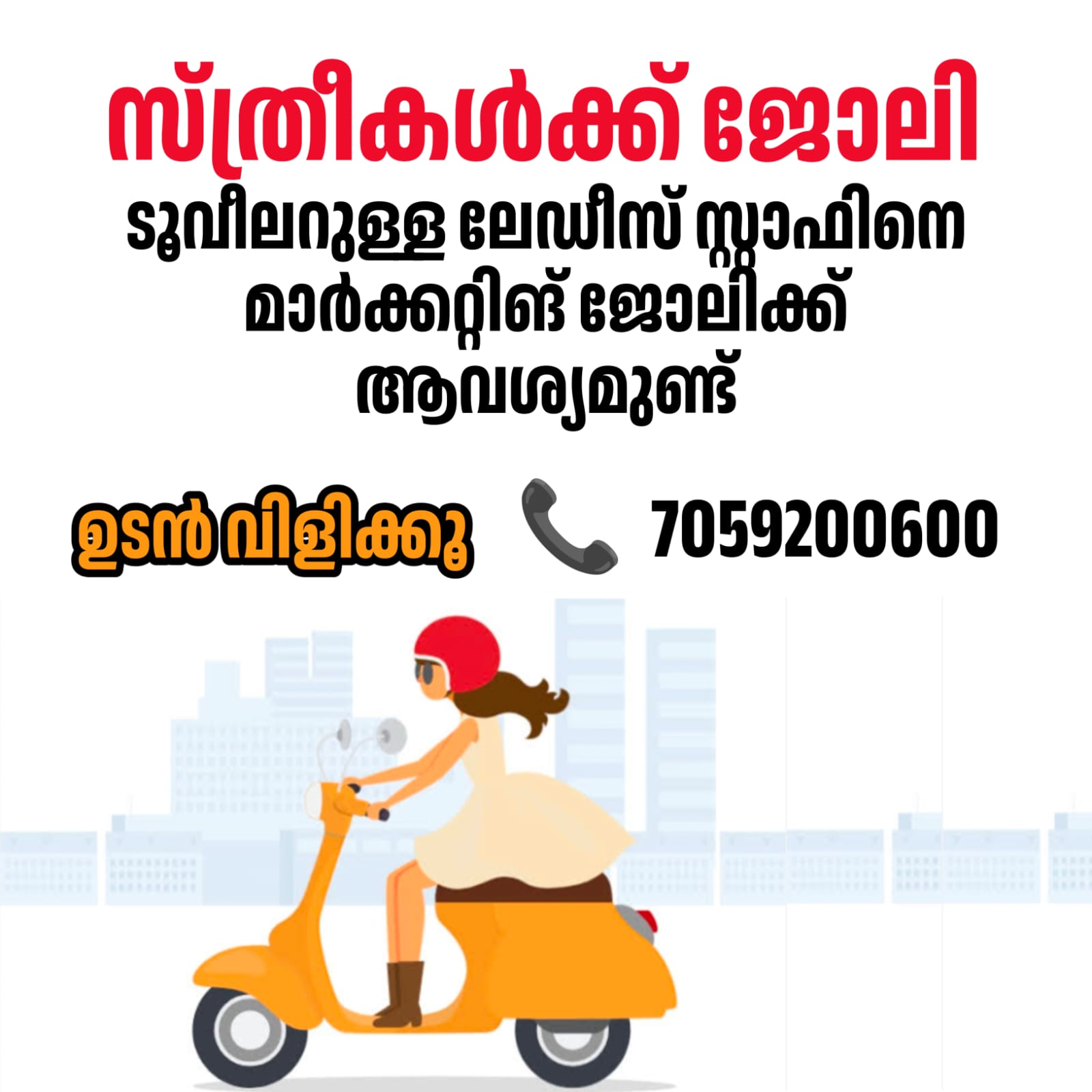ടൂവീലറുള്ള ലേഡീസ് സ്റ്റാഫിനെ മാർക്കറ്റിങ് ജോലിക്ക് ആവശ്യമുണ്ട്