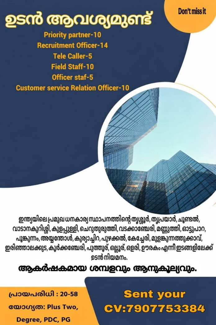 *ഇന്ത്യയിലെ പ്രമുഖ ധനകാര്യസ്ഥാപനത്തിൻ്റെ തൃശ്ശൂർ, തൃപ്രയാർ, ചൂണ്ടൽ, വാടാനകുറിശ്ശി, കുളപ്പുള്ളി, ചെറുതുരുത്തി, വടക്കാഞ്ചേരി, മണ്ണുത്തി, ഓട്ടുപാറ, പൂങ്കുന്നം, അയ്യന്തോൾ, കുര്യാച്ചിറ, പുഴക്കൽ, കേച്ചേരി, മുളങ്കുന്നത്തുക്കാവ്, ഇരിഞ്ഞാലക്കുട, കൂർക്കഞ്ചേരി, പുത്തൂര്, ഒല്ലൂര്, ഒളരി, ഊരകം എന്നീ ഇടങ്ങളിലേക്ക് ഉടൻ നിയമനം*