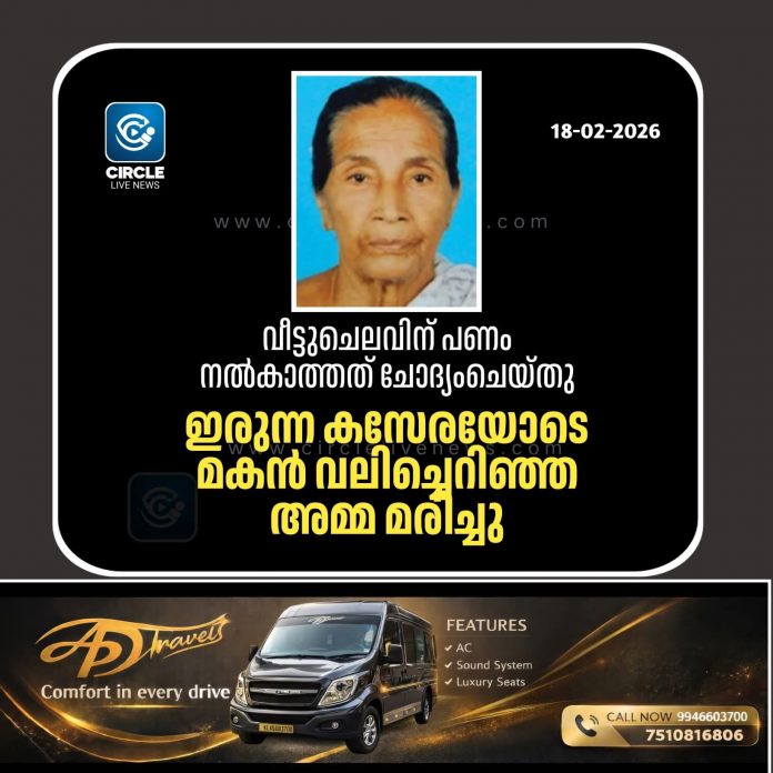 കണ്ണൂർ: ഇരുന്ന കസേരയടക്കം മകൻ മുറ്റത്തേക്ക് വലിച്ചെറിഞ്ഞ അമ്മ ചികിത്സയ്ക്കിടെ മരിച്ചു. പള്ളിയാംമൂല ലക്ഷംവീട് നഗറിലെ വി.ശാന്ത (88) ആണ് മരിച്ചത്. സംഭവത്തിനുശേഷം ഒളിവിൽപ്പോയ മകൻ സജീവനെ കഴിഞ്ഞദിവസം ബന്ധുക്കളുടെ സഹായത്തോടെ പോലീസ് പിടികൂടി. കഴിഞ്ഞ ബുധനാഴ്ച രാത്രി 11-ഓടെയാണ് സംഭവം. വീട്ടുചെലവിന് സജീവൻ പണം നൽകാത്തത് ശാന്ത ചോദ്യംചെയ്തതിന്റെ വൈരാഗ്യത്തിൽ കസേരയിൽനിന്ന് എഴുന്നേൽക്കാൻ അനുവദിക്കാതെ മുറ്റത്തേക്ക് വലിച്ചെറിയുകയായിരുന്നു. പ്രതി മദ്യലഹരിയിലായിരുന്നുവെന്ന് പോലീസ് പറഞ്ഞു. തലയടിച്ചുവീണ ശാന്തയെ വീട്ടുകാരും ഓടിക്കൂടിയ അയൽക്കാരും ചേർന്ന് കണ്ണൂരിലെ ആസ്പത്രിയിലെത്തിച്ചു. അത്യാഹിതവിഭാഗത്തിൽ ചികിത്സയിലിരിക്കെ ചൊവ്വാഴ്ച രാവിലെയായിരുന്നു മരണം. വധശ്രമത്തിന് റിമാൻഡിൽ കഴിയുന്ന സജീവനെതിരെ കൊലക്കുറ്റത്തിന് കേസെടുക്കുമെന്ന് പോലീസ് അറിയിച്ചു. ഭർത്താവ്: പരേതനായ രാമൻ. മറ്റുമക്കൾ: രഞ്ജിനി, സജിത, സജിനി, പരേതനായ ബാലൻ. മരുമക്കൾ: പ്രകാശിനി, മനോഹരൻ, സരസ, പരേതരായ രവീന്ദ്രൻ, അനിൽകുമാർ.