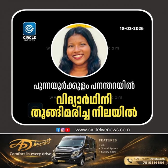 പുന്നയൂർക്കുളം: പനന്തറയിൽ വിദ്യാർഥിനിയെ വീടിനുള്ളിൽ തൂങ്ങിമരിച്ച നിലയിൽ കണ്ടെത്തി. പനന്തറ ആറ്റുപുറത്ത് വീട്ടിൽ സുനിലിൻ്റെ മകൾ സുഗിന (14) ആണ് മരിച്ചത്. തിങ്കളാഴ്ച രാത്രിയിലായിരുന്നു സംഭവം. കടിക്കാട് സ്കൂൾ വിദ്യാർഥിയായിരുന്നു. മാതാവ്: ഗീത. സഹോദരി: സുഖിത.