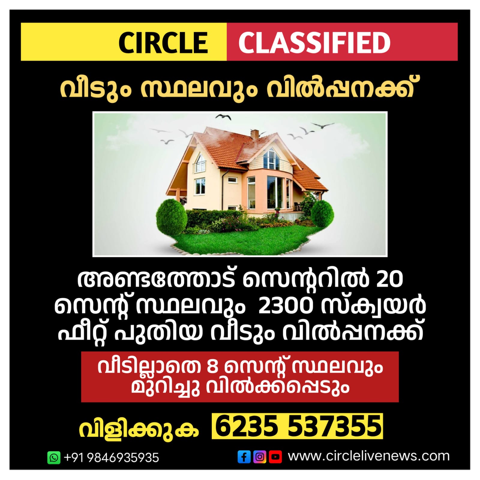 FEATURED അണ്ടത്തോട് സെന്ററിൽ 20 സെന്റ് സ്ഥലവും 2300 സ്ക്വയർ ഫീറ്റ് പുതിയ വീടും വിൽപ്പനക്ക് By circlelivenews February 22, 2026 - 10:33 AM 0 0 Share FacebookTwitterPinterestWhatsApp വീടില്ലാതെ 8 സെൻ്റ് സ്ഥലവും മുറിച്ചു വിൽക്കപ്പെടും ഉടൻ വിളിക്കുക6235 537355 Tagsചാവക്കാട്തൃശൂർ Share FacebookTwitterPinterestWhatsApp Previous articleഫിസിയോതെറാപ്പി ഇനി നിങ്ങളുടെ വീട്ടിൽ വന്നു ചെയ്തു തരുന്നു circlelivenewshttp://Circlelivenews.com RELATED ARTICLES FEATURED ഫിസിയോതെറാപ്പി ഇനി നിങ്ങളുടെ വീട്ടിൽ വന്നു ചെയ്തു തരുന്നു February 20, 2026 - 3:10 PM FEATURED പുന്നയൂർക്കുളം പനന്തറയിൽ വിദ്യാർഥിനി തൂങ്ങിമരിച്ച നിലയിൽ February 18, 2026 - 10:33 AM FEATURED കുറഞ്ഞ ചിലവിൽ നിങ്ങളുടെ സ്വപ്ന യാത്രകൾ ഞങ്ങളുടെ കൂടെ …! February 18, 2026 - 10:31 AM - Advertisment - Most Popular ഫിസിയോതെറാപ്പി ഇനി നിങ്ങളുടെ വീട്ടിൽ വന്നു ചെയ്തു തരുന്നു February 20, 2026 - 3:10 PM പുന്നയൂർക്കുളം പനന്തറയിൽ വിദ്യാർഥിനി തൂങ്ങിമരിച്ച നിലയിൽ February 18, 2026 - 10:33 AM കുറഞ്ഞ ചിലവിൽ നിങ്ങളുടെ സ്വപ്ന യാത്രകൾ ഞങ്ങളുടെ കൂടെ …! February 18, 2026 - 10:31 AM വീട്ടുചെലവിന് പണം നൽകാത്തത് ചോദ്യംചെയ്തു; ഇരുന്ന കസേരയോടെ മകൻ വലിച്ചെറിഞ്ഞ അമ്മ മരിച്ചു February 18, 2026 - 8:12 AM Load more Recent Comments