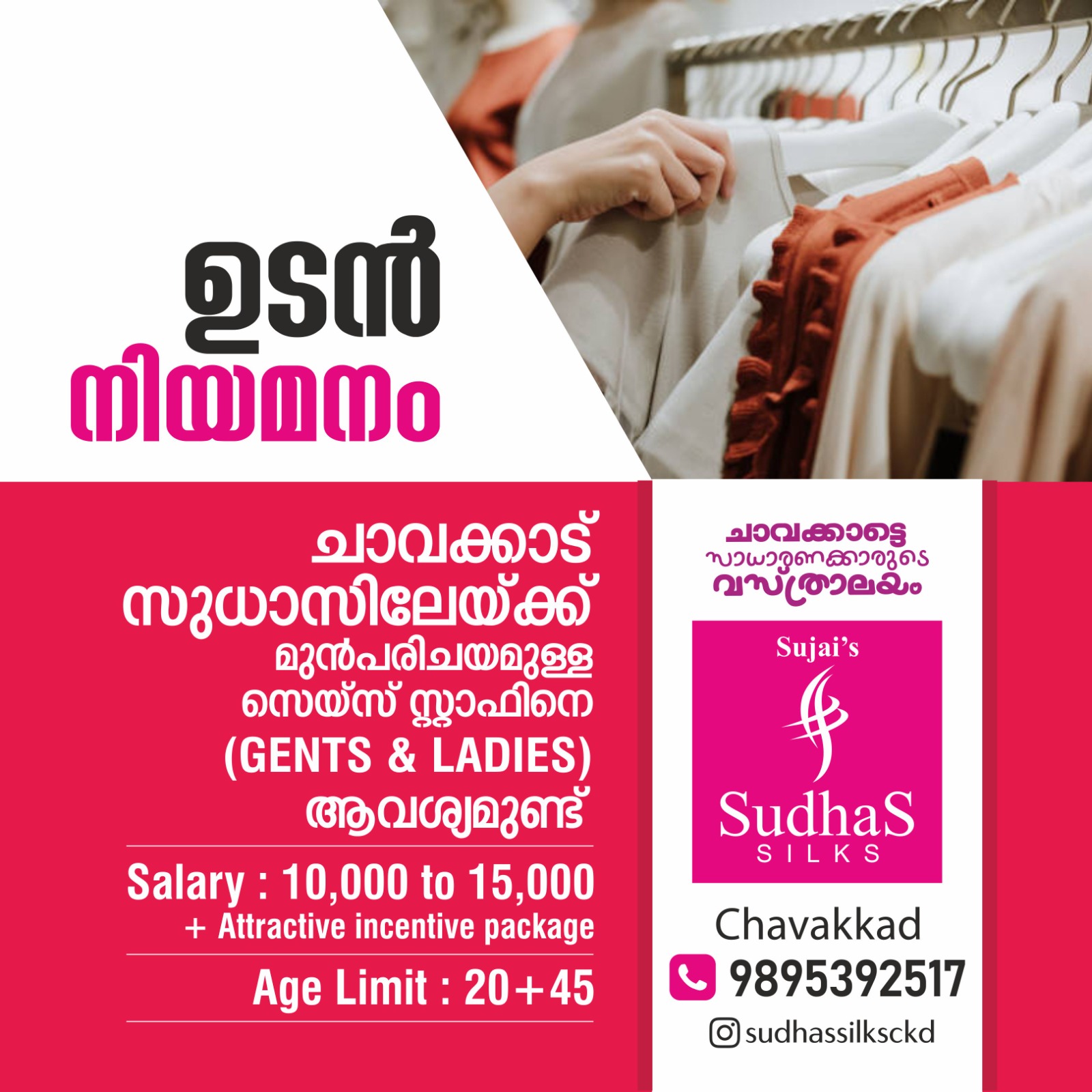 FEATURED ഉടൻ നിയമനം By circlelivenews February 22, 2026 - 1:28 PM 0 1 Share FacebookTwitterPinterestWhatsApp സാലറി 10000 മുതൽ 15,000 വരെ ▪️ *കൂടാതെ attractive incentive package* *ചാവക്കാട് സുധാസ് സിൽക്സിലേക്ക് മുൻ പരിചയം ഉള്ള സെയിൽ സ്റ്റാഫിനെ ആവശ്യമുണ്ട്* * *(Gents & Ladies)* *Age Limit – 20+45* *ഉടൻ വിളിക്കുക* 9895392517* Tagsചാവക്കാട്തൃശൂർ Share FacebookTwitterPinterestWhatsApp Previous articleചാവക്കാട് എൻപീസിൽ EID & RAMAZAN OFFER circlelivenewshttp://Circlelivenews.com RELATED ARTICLES FEATURED ചാവക്കാട് എൻപീസിൽ EID & RAMAZAN OFFER February 22, 2026 - 11:17 AM FEATURED അണ്ടത്തോട് സെന്ററിൽ 20 സെന്റ് സ്ഥലവും 2300 സ്ക്വയർ ഫീറ്റ് പുതിയ വീടും വിൽപ്പനക്ക് February 22, 2026 - 10:33 AM FEATURED ഫിസിയോതെറാപ്പി ഇനി നിങ്ങളുടെ വീട്ടിൽ വന്നു ചെയ്തു തരുന്നു February 20, 2026 - 3:10 PM - Advertisment - Most Popular ചാവക്കാട് എൻപീസിൽ EID & RAMAZAN OFFER February 22, 2026 - 11:17 AM അണ്ടത്തോട് സെന്ററിൽ 20 സെന്റ് സ്ഥലവും 2300 സ്ക്വയർ ഫീറ്റ് പുതിയ വീടും വിൽപ്പനക്ക് February 22, 2026 - 10:33 AM ഫിസിയോതെറാപ്പി ഇനി നിങ്ങളുടെ വീട്ടിൽ വന്നു ചെയ്തു തരുന്നു February 20, 2026 - 3:10 PM പുന്നയൂർക്കുളം പനന്തറയിൽ വിദ്യാർഥിനി തൂങ്ങിമരിച്ച നിലയിൽ February 18, 2026 - 10:33 AM Load more Recent Comments
