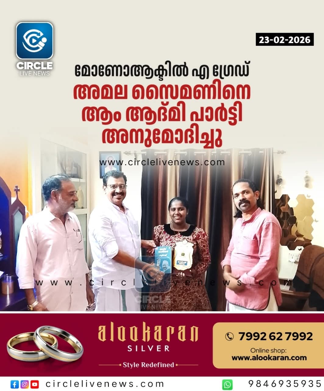 ഗുരുവായൂർ: സംസ്ഥാന സ്കൂൾ കലോത്സവത്തിൽ ഹയർ സെക്കൻഡറി വിഭാഗം മോണോആക്ട് മത്സരത്തിൽ എ ഗ്രേഡ് കരസ്ഥമാക്കിയ അമല സൈമണിനെ ആം ആദ്മി പാർട്ടി അനുമോദിച്ചു. അരവിന്ദ് കേജ്രിവാൾ എഴുതിയ സ്വരാജ് പുസ്തകം ജില്ലാ ജോയിനൻ്റ് സെക്രട്ടറി പോളി ഫ്രാൻസിസ് അമല സൈമണിന് സമ്മാനിച്ചു. ഗുരുവായൂർ മണ്ഡലം പ്രസിഡണ്ട് സതീഷ് വിജയൻ, ഗുരുവായൂർ മുനിസിപ്പാലിറ്റി പ്രസിഡണ്ട് ജോൺസൺ പാലുവായ് എന്നിവർ പങ്കെടുത്തു.