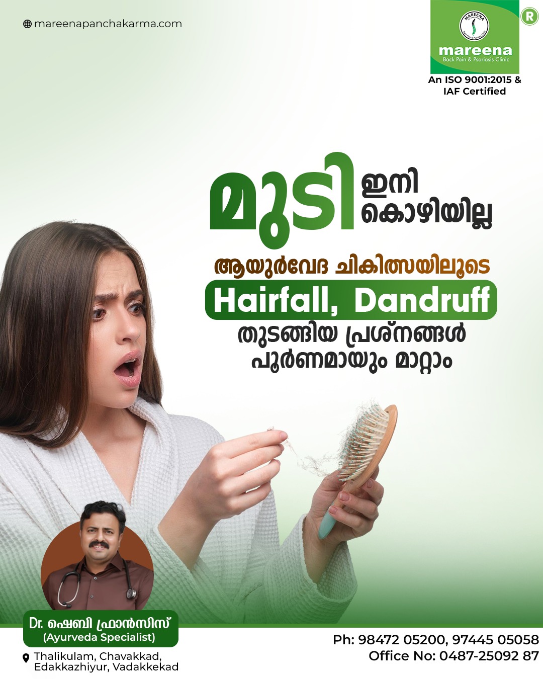 Mareena Panchakarma ആയുർവേദ ചികിത്സയിലൂടെ Hairfall, Dandruff, തലച്ചർമ്മ പ്രശ്നങ്ങൾ എന്നിവയ്ക്ക് സ്ഥിരമായ പരിഹാരം.