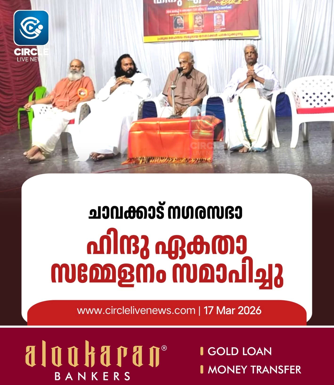 ചാവക്കാട: ചാവക്കാട് നഗരസഭ ഹിന്ദു ഏകതാ സമ്മേളനം നീലകണ്ഠന് നമ്പൂതിരി ഉദ്ഘാടനം ചെയ്തു. സാഹിത്യകാരന് രാധാകൃഷ്ണന് കാക്കശ്ശേരി അധ്യക്ഷത വഹിച്ചു. വിദ്യാസാഗര് ഗുരുമൂര്ത്തി മുഖ്യപ്രഭാഷണം നടത്തി. അഖിലലോക നാരായണസഭ അധ്യക്ഷന് ടി.വി. ശ്രീനിവാസന്, സ്വാമി ഹരിനാരായണന്, സ്വാഗതസംഘം ചെയര്മാന് സുധീര് പണിക്കര്, സഹരക്ഷാധികാരി ബാബു താമരശ്ശേരി, ബേബി കരിപ്പോട്ട്, സുരേഷ് തിരുവത്ര, കെ.ജി രാധാകൃഷ്ണന്, രഘു കൂര്ക്കപറമ്പില്, ഷീബ ജയപ്രകാശ്, കെ.എ ബിജു, സുബ്രഹ്മണ്യന് പുന്ന, ജീജ ജയരാജ് എന്നിവര് സംസാരിച്ചു. സമ്മേളനത്തിന്റെ ഭാഗമായി വിവിധ കലാപരിപാടികള്, നാരായണീയ പാരായണം, മെഗാ തിരുവാതിര, വീരനാട്യം എന്നിവയുണ്ടായി.