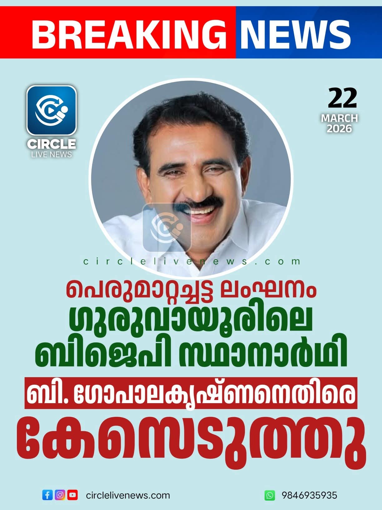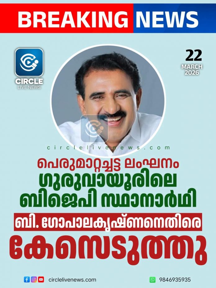 ഗുരുവായൂർ: മാതൃകാ പെരുമാറ്റച്ചട്ടം ലംഘിച്ചതിന് ബിജെപി സംസ്ഥാന വൈസ് പ്രസിഡന്റും ഗുരുവായൂർ മണ്ഡലം സ്ഥാനാർഥിയുമായ അഡ്വ. ബി. ഗോപാലകൃഷ്ണനെതിരെ കേസെടുത്തു. വിവാദ പരാമർശത്തിന്റെ പേരിൽ ലഭിച്ച പരാതിയെത്തുടർന്ന് മുഖ്യ തിരഞ്ഞെടുപ്പ് ഓഫീസർ ഡോ. രത്തൻ യു. ഖേൽക്കറുടെ നിർദ്ദേശപ്രകാരം തൃശൂർ ജില്ലാ കളക്ടറാണ് നടപടിയെടുത്തത്. ജനപ്രാതിനിധ്യ നിയമം (1951) ലെ 123(3) വകുപ്പും തിരഞ്ഞെടുപ്പ് കമ്മിഷന്റെ പെരുമാറ്റച്ചട്ട വ്യവസ്ഥകളും ലംഘിച്ചതിനാണ് കേസെടുക്കാൻ ഉത്തരവിട്ടത്. തുടർന്ന് ഗുരുവായൂർ ടെമ്പിൾ പോലീസ് കേസെടുത്തു. വോട്ട് തേടുന്നതിനായി ജാതി അല്ലെങ്കിൽ സാമുദായിക വികാരങ്ങൾ ഉപയോഗിക്കാൻ പാടില്ലെന്ന പെരുമാറ്റച്ചട്ടത്തിലെ കർശന നിർദ്ദേശം ഗോപാലകൃഷ്ണൻ ലംഘിച്ചതായി അധികൃതർ കണ്ടെത്തി. ആരാധനാലയങ്ങൾ തിരഞ്ഞെടുപ്പ് പ്രചാരണത്തിനുള്ള വേദിയായി ഉപയോഗിക്കരുതെന്ന ചട്ടവും ഇദ്ദേഹം പങ്കുവെച്ച വീഡിയോയിലൂടെ ലംഘിക്കപ്പെട്ടിട്ടുണ്ട്.ജില്ലാ കളക്ടറുടെ ഉത്തരവിനെത്തുടർന്ന് വിവാദമായ വീഡിയോ സോഷ്യൽ മീഡിയയിൽ നിന്ന് നീക്കം ചെയ്തു. ഇതിനുപുറമെ, ഗുരുവായൂർ ടെമ്പിൾ പോലീസ് സ്റ്റേഷനിൽ എഫ്ഐആർ രജിസ്റ്റർ ചെയ്ത് കേസെടുത്തിട്ടുണ്ട്