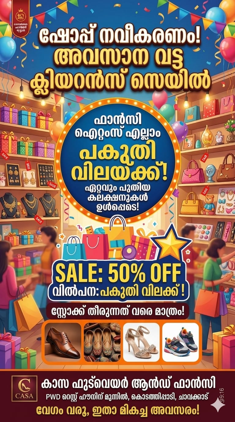 🌟​ *ഷോപ്പ് നവീകരണത്തിന്റെ ഭാഗമായി എല്ലാ ഫാൻസി ഐറ്റംസുകളും ഇപ്പോൾ പകുതി വിലയിൽ* !
