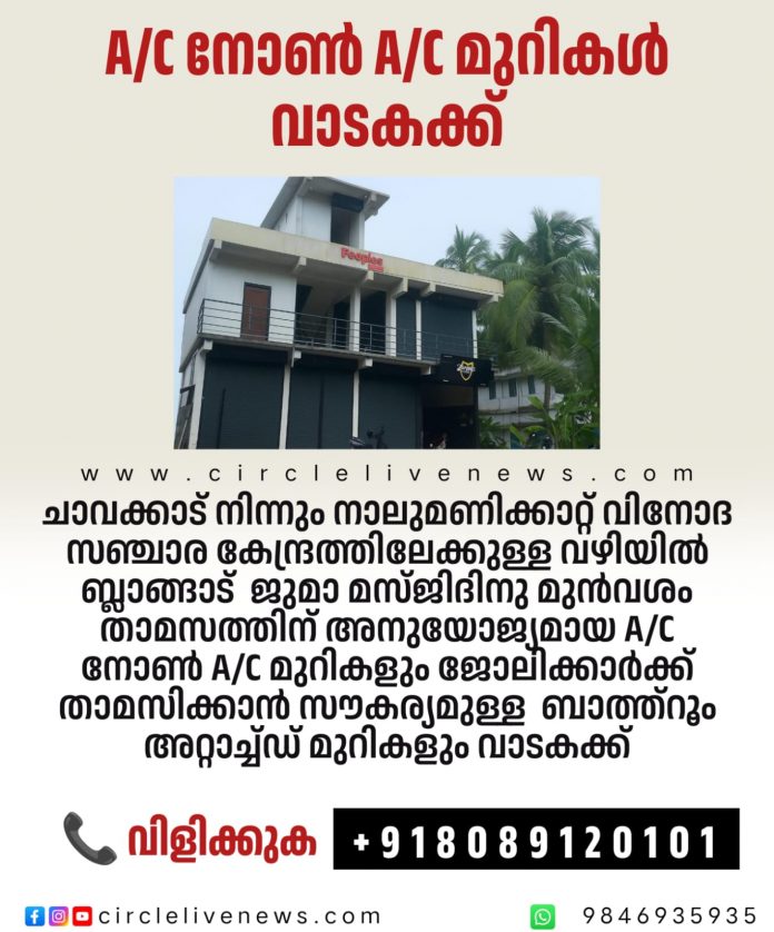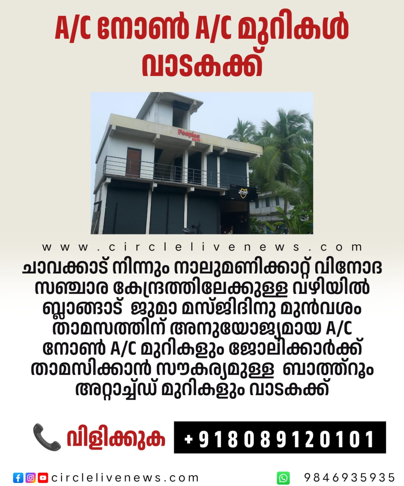ചാവക്കാട് നിന്നും നാലുമണിക്കാറ്റ് വിനോദ സഞ്ചാര കേന്ദ്രത്തിലേക്കുള്ള വഴിയിൽ ബ്ലാങ്ങാട് ജുമാ മസ്ജിദിനു മുൻവശം താമസത്തിന് അനുയോജ്യമായ A/C നോൺ A/C മുറികളും ജോലിക്കാർക്ക് താമസിക്കാൻ സൗകര്യമുള്ള ബാത്ത്റൂം അറ്റാച്ച്ഡ് മുറികളും വാടകക്ക്
