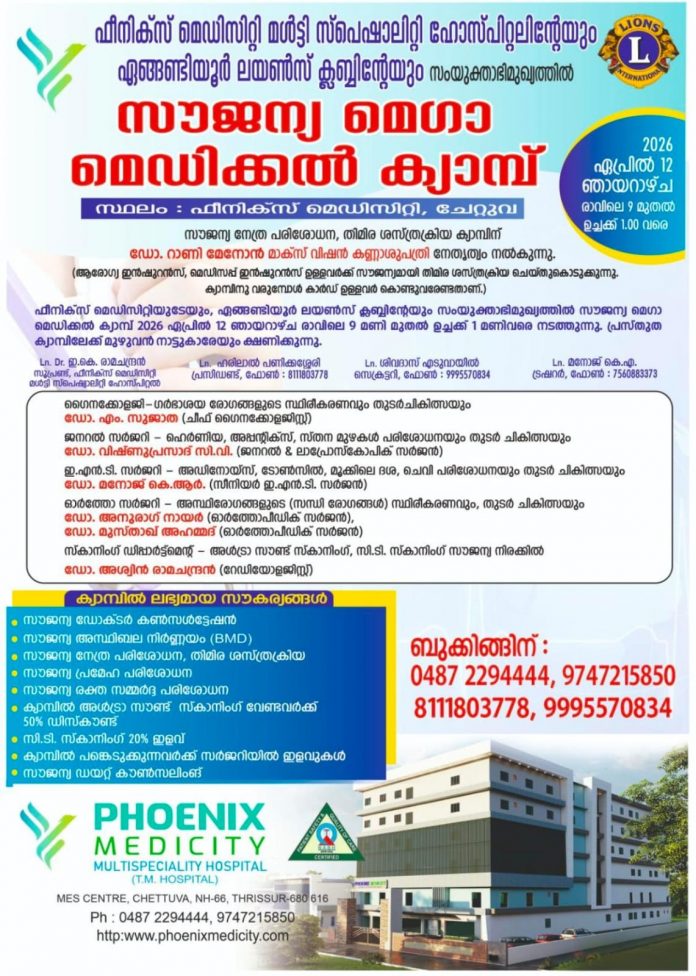 ചേറ്റുവ ഫിനിക്സ് മെഡിസിറ്റി മൾട്ടി സ്പെഷ്യലിറ്റി ഹോസ്പിറ്റൽ എങ്ങണ്ടിയൂർ ലയൺസ് ക്ലബ്ബിന്റെ സഹകരണത്തോടെ സൗജന്യ മെഗാ മെഡിക്കൽ ക്യാമ്പ് സംഘടിപ്പിക്കുന്നു