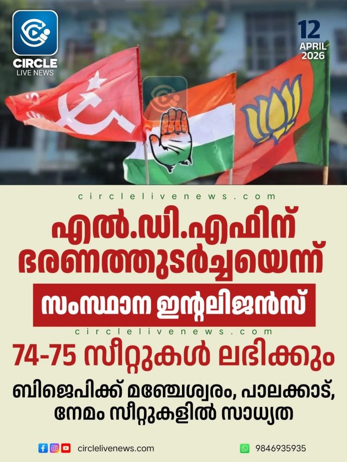 തിരുവനന്തപുരം: എൽഡിഎഫിൻ്റെ ഭരണം തുടർച്ച ഉറപ്പെന്ന് സംസ്ഥാന ഇൻ്റലിജൻസ് ബ്യൂറോയുടെ റിപ്പോർട്ട്. മുഖ്യമന്ത്രിക്ക് കൈമാറിയ റിപ്പോർട്ടിലാണ് ഭരണത്തുടർച്ചയുണ്ടാകുമെന്ന് വിജിലൻസ് ചൂണ്ടിക്കാണിക്കുന്നത്. എൽഡിഎഫിന് 74-75 സീറ്റുകൾ ലഭിച്ചേക്കുമെന്നാണ് ഇൻ്റലിജൻസ് മുഖ്യമന്ത്രിക്ക് നൽകിയ റിപ്പോർട്ടിൽ വ്യക്തമാക്കിയിരിക്കുന്നത്. എൽഡിഎഫിന് ഉറച്ച 67 സീറ്റും യുഡിഎഫിന് ഉറച്ച 45 സീറ്റുമാണ് ഉള്ളതെന്നാണ് ഇൻ്റലിജൻസ് റിപ്പോർട്ടിൽ പറയുന്നത്. ബിജെപിക്ക് മഞ്ചേശ്വരം, പാലക്കാട്, നേമം സീറ്റുകളിൽ സാധ്യതയുണ്ടെന്നും റിപ്പോർട്ട് ചൂണ്ടിക്കാണിക്കുന്നു.
