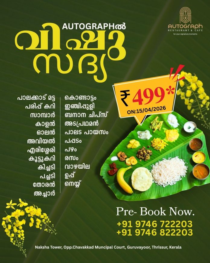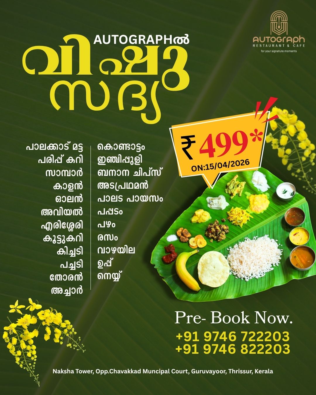 FEATURED വിഷുവിന് സ്പെഷ്യൽ വിഷു സദ്യ🌟 By circlelivenews April 14, 2026 - 4:01 PM 0 0 Share FacebookTwitterPinterestWhatsApp വിഭവസമൃദ്ദമായ വിഷു സദ്യയ്ക്കായിമുൻകൂട്ടി ബുക്ക് ചെയ്യുക 0487 2500 222974622203974682203 🟩 ഓട്ടോഗ്രാഫ്റസ്റ്റോറൻ്റ് & കഫേനക്ഷത്ര ടവർ, കോടതിക്ക് എതിർ വശം, ചാവക്കാട് Tagsചാവക്കാട്തൃശൂർ Share FacebookTwitterPinterestWhatsApp Previous article🟦 സ്ഥലം വിൽപ്പനക്ക് circlelivenewshttp://Circlelivenews.com RELATED ARTICLES FEATURED 🟦 സ്ഥലം വിൽപ്പനക്ക് April 14, 2026 - 2:55 PM FEATURED വിഷുവിന് സ്പെഷ്യൽ പായസം വാങ്ങാം🌟 April 14, 2026 - 1:32 PM FEATURED 🌟*50% Discount* April 14, 2026 - 11:47 AM - Advertisment - Most Popular 🟦 സ്ഥലം വിൽപ്പനക്ക് April 14, 2026 - 2:55 PM വിഷുവിന് സ്പെഷ്യൽ പായസം വാങ്ങാം🌟 April 14, 2026 - 1:32 PM 🌟*50% Discount* April 14, 2026 - 11:47 AM ഒരു മാസം 20000 മുതൽ 26000 വരെ നേടാം‼️ April 13, 2026 - 12:57 PM Load more Recent Comments