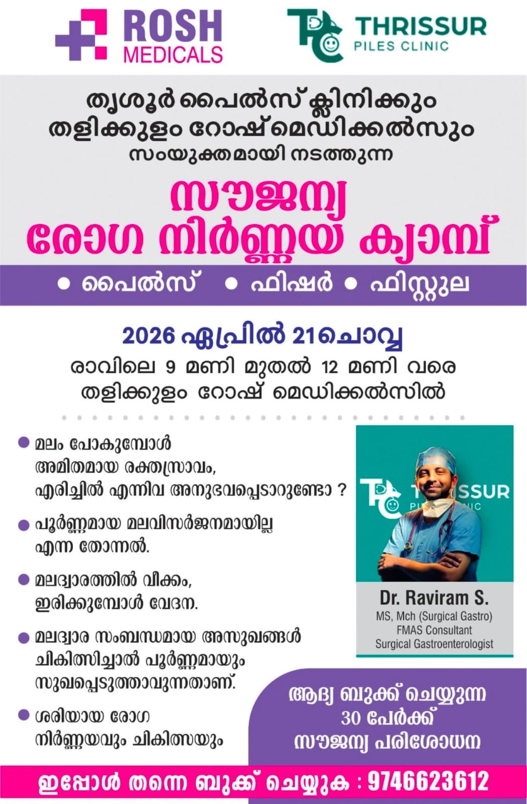 🔷 തൃശൂർ പൈൽസ് ക്ലിനിക്കും തളിക്കുളം റോഷ്‌ മെഡിക്കൽസും സംയുക്തമായി സംഘടിപ്പിക്കുന്നു
