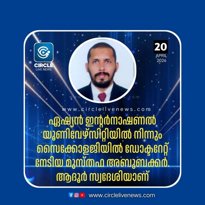 ഏഷ്യൻ ഇന്റർനാഷണൽ യൂണിവേഴ്സിറ്റിയിൽ നിന്നും സൈക്കോളജിയിൽ ഡോക്ടറേറ്റ് നേടിയ മുസ്തഫ അബൂബക്കർ. ആദൂർ സ്വദേശിയാണ്