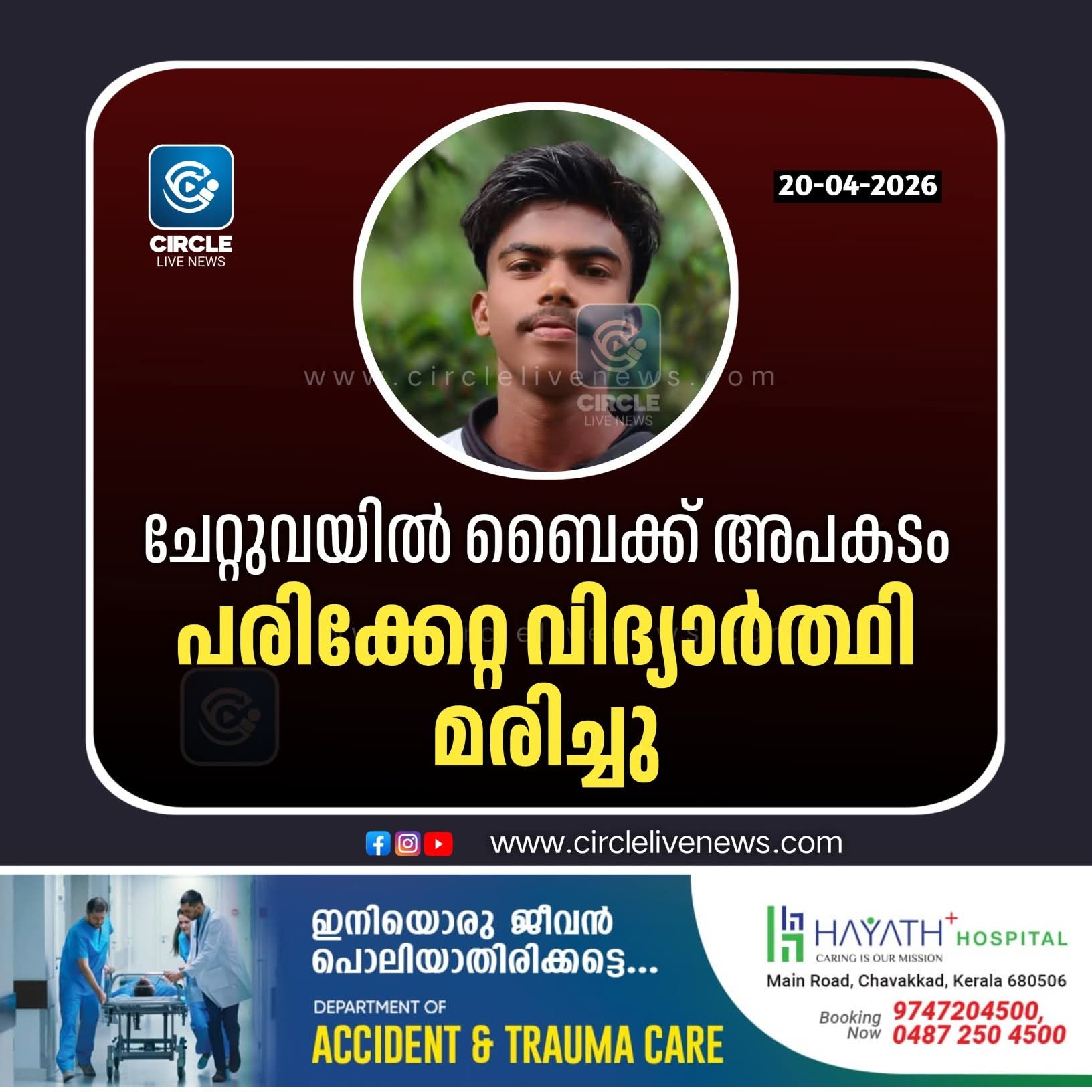 ഏങ്ങണ്ടിയൂർ: ബൈക്ക് അപകടത്തിൽ പരിക്കേറ്റ് ചികിത്സയിലായിരുന്ന വിദ്യാർത്ഥി മരിച്ചു. ചേറ്റുവ ജി എം യു പി സ്കൂളിന് സമീപം വട്ടം പറമ്പത്ത് ജലീലിൻ്റെ മകൻ സിനാനാ(18)ണ് മരിച്ചത്. ശനിയാഴ്ച രാത്രിയിലായിരുന്നു അപകടം. സിനാൻ ഓടിച്ച ബുള്ളറ്റ് ചേറ്റുവ ജി.എം.യു.പി സ്കൂളിനു മുന്നിൽ അപകടത്തിൽ പെടുകയായിരുന്നു. പരിക്കേറ്റ സിനാനെ ഉടൻതന്നെ ചേറ്റുവ ലെവൽ ഓഫ് കെയർ ആംബുലൻസ് പ്രവർത്തകർ ചേറ്റുവ ഫിനിക്സ് മെഡിസിറ്റി ആശുപത്രിയിലും പിന്നീട് തൃശ്ശൂരിലെ സ്വകാര്യ ആശുപത്രിയിലും പ്രവേശിപ്പിച്ചിരുന്നു. ചികിത്സയിലിരിക്കെ ഇന്ന് വൈകിട്ടാണ് മരണം സംഭവിച്ചത്.