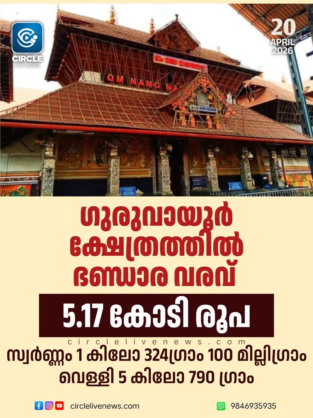 ഗുരുവായൂർ: ഗുരുവായൂർ ക്ഷേത്രത്തിൽ ഏപ്രിൽ മാസത്തെ ഭണ്ഡാരം എണ്ണൽ ഇന്ന് വൈകീട്ട് (ഏപ്രിൽ 20) പൂർത്തിയായപ്പോൾ ലഭിച്ചത് 5,17,99,642 രൂപ. കൂടാതെ 1 കിലോ 324ഗ്രാം 100 മില്ലിഗ്രാം സ്വർണ്ണവും 5 കിലോഗ്രാം 790 ഗ്രാം വെള്ളിയും ലഭിച്ചു. കേന്ദ്ര സർക്കാർ പിൻവലിച്ച രണ്ടായിരം രൂപയുടെ 12 നോട്ടുകളും നിരോധിച്ച ആയിരം രൂപയുടെ 14, അഞ്ഞൂറിൻ്റെ 66 നോട്ടുകളും ലഭിച്ചു. ധനലക്ഷ്മി ബാങ്ക് ഗുരുവായൂർ ശാഖയ്ക്കായിരുന്നു എണ്ണൽ ചുമതല കിഴക്കേ നടയിലെ എസ്.ബി.ഐ ഇ ഭണ്ഡാരം വഴി 2,76,549രൂപയും കിഴക്കേ നടയിലെ പഞ്ചാബ് നാഷണൽ ബാങ്ക് ഇ ഭണ്ഡാരം വഴി 41,739 രൂപയും പടിഞ്ഞാറെ നടയിലെ യുബിഐ ഇ ഭണ്ഡാരം വഴി 84,053രൂപയും ഇന്ത്യൻ ബാങ്ക് ഇ ഭണ്ഡാരം വഴി 53,324രൂപയും ഐ.സി.ഐ.സി.ഐ ഇ ഭണ്ഡാരം വഴി 76,840 രൂപയും ധനലക്ഷ്മി ബാങ്ക് ഇ ഭണ്ഡാരം വഴി 77,537രൂപയും ലഭിച്ചു.