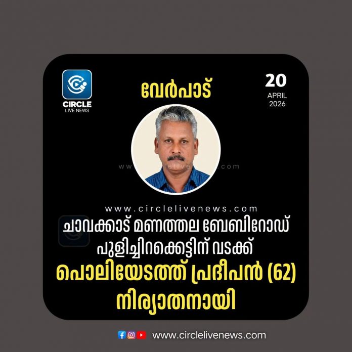 ചാവക്കാട്: മണത്തല ബേബിറോഡ് പുളിച്ചിറക്കെട്ടിന് വടക്ക് പൊലിയേടത്ത് പ്രദീപൻ (62) നിര്യാതനായി. ഭാര്യ: ഉഷ. മക്കൾ: പ്രതീക്ഷ, പ്രജീഷ്. മരുമകൻ: വിനോദ്. സംസ്കാരം നാളെ (ചൊവ്വ) രാവിലെ 11.30ന് ചാവക്കാട് നഗരസഭ വാതക ശ്മശാനത്തിൽ നടക്കും.