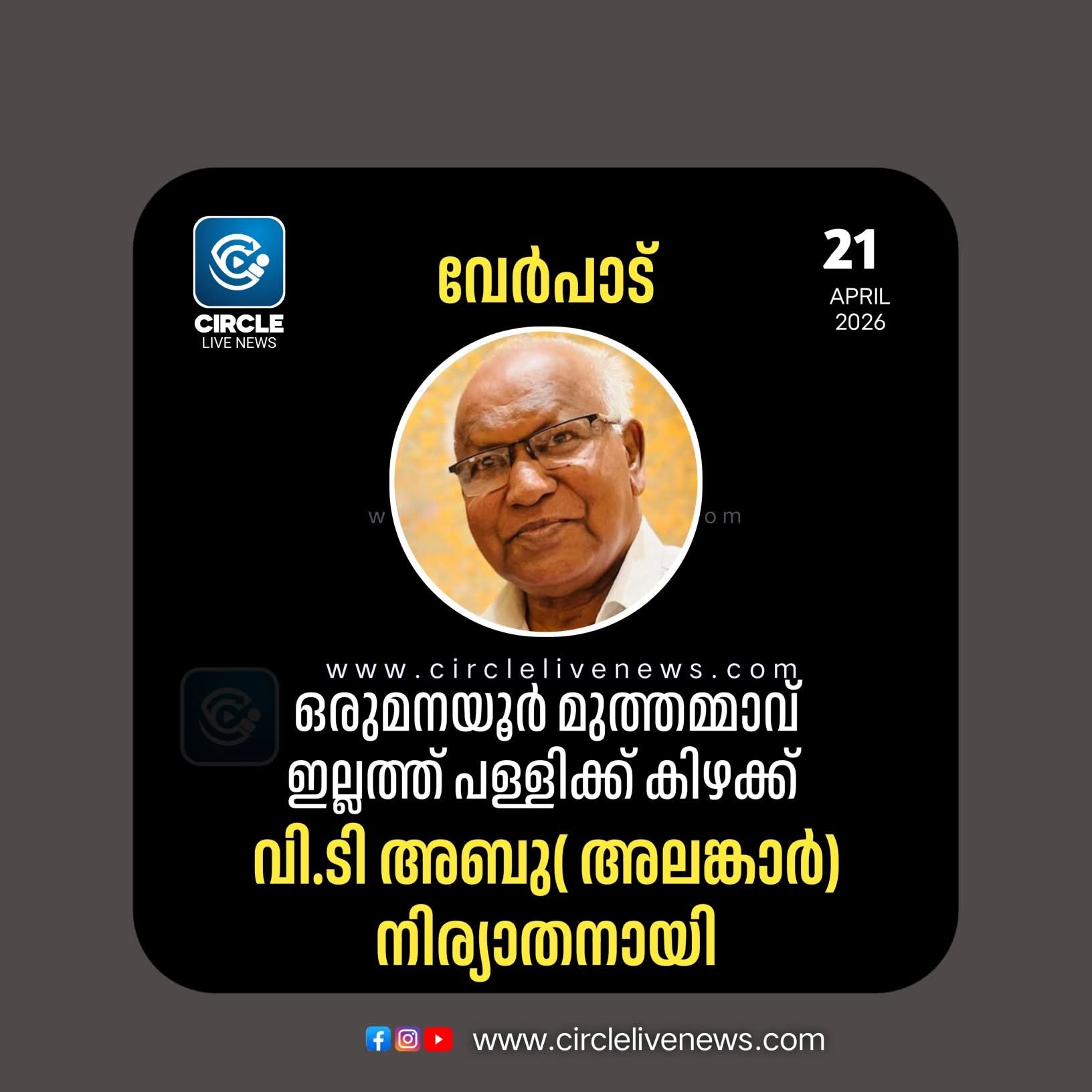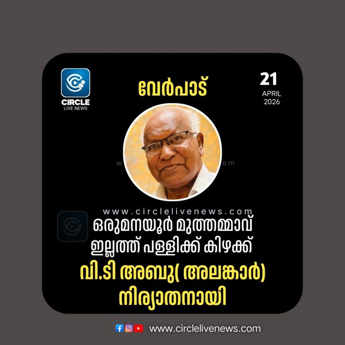ചാവക്കാട്: ഒരുമനയൂർ മുത്തമ്മാവ് ഇല്ലത്ത് പള്ളിക്ക് കിഴക്ക് വി.ടി അബു( അലങ്കാർ) നിര്യാതനായി. ഭാര്യ: ആമിനക്കുട്ടി. മക്കൾ: ഫിയാസ്, റിയാസ്, സിയാസ്. മരുമക്കൾ: നിഷ, ഐഷ, സജന.