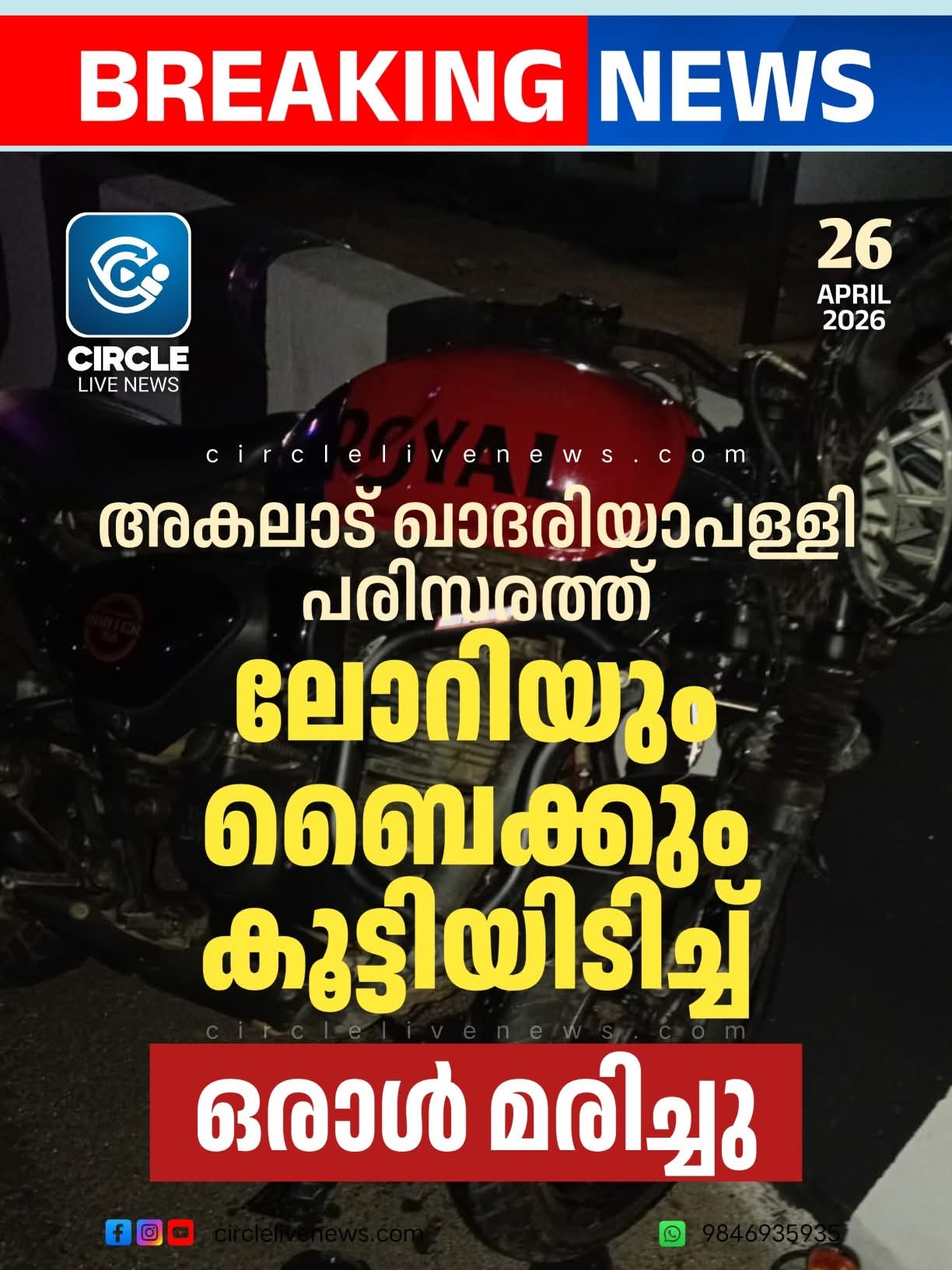 FEATURED അകലാട് ഖാദരിയാപള്ളി പരിസരത്ത് ലോറിയും ബൈക്കും കൂട്ടിയിടിച്ച് ഒരാൾ മരിച്ചു By circlelivenews April 26, 2026 - 5:37 AM 0 1 Share FacebookTwitterPinterestWhatsApp ചാവക്കാട്: അകലാട് ഖാദരിയാപള്ളി പരിസരത്ത് ലോറിയും ബൈക്കും കൂട്ടിയിടിച്ച് ഒരാൾ മരിച്ചു. വയനാട് സുൽത്താൻബത്തേരി സ്വദേശിയാണ് മരിച്ചതെന്നാണ് വിവരം. Update……… Tagsചാവക്കാട്തൃശൂർ Share FacebookTwitterPinterestWhatsApp Previous articleഗുരുവായൂരിൽ ആശങ്ക പരത്താൻ ശ്രമം; വസ്തുതാ വിരുദ്ധമായ റിപ്പോർട്ടുകൾ നൽകുന്ന മാധ്യമങ്ങൾക്കെതിരെ നിയമ നടപടി: ഗുരുവായൂർ ദേവസ്വം ചെയർമാൻ circlelivenewshttp://Circlelivenews.com RELATED ARTICLES FEATURED ഗുരുവായൂരിൽ ആശങ്ക പരത്താൻ ശ്രമം; വസ്തുതാ വിരുദ്ധമായ റിപ്പോർട്ടുകൾ നൽകുന്ന മാധ്യമങ്ങൾക്കെതിരെ നിയമ നടപടി: ഗുരുവായൂർ ദേവസ്വം ചെയർമാൻ April 25, 2026 - 1:16 PM FEATURED മാഞ്ചസ്റ്റർ സാൽഫോഡ് യൂണിവേഴ്സിറ്റിയിൽ നിന്നും കെമിസ്ട്രിയിൽ ഡോക്ടറേറ്റ്; ചാവക്കാടിന് അഭിമാനമായി മുബീന അഷ്കർ ബാബു April 25, 2026 - 10:53 AM FEATURED കടപ്പുറം മുനക്കകടവ് അഴിമുഖത്ത് യുവതിക്ക് പാമ്പ് കടിയേറ്റു April 25, 2026 - 9:54 AM - Advertisment - Most Popular ഗുരുവായൂരിൽ ആശങ്ക പരത്താൻ ശ്രമം; വസ്തുതാ വിരുദ്ധമായ റിപ്പോർട്ടുകൾ നൽകുന്ന മാധ്യമങ്ങൾക്കെതിരെ നിയമ നടപടി: ഗുരുവായൂർ ദേവസ്വം ചെയർമാൻ April 25, 2026 - 1:16 PM മാഞ്ചസ്റ്റർ സാൽഫോഡ് യൂണിവേഴ്സിറ്റിയിൽ നിന്നും കെമിസ്ട്രിയിൽ ഡോക്ടറേറ്റ്; ചാവക്കാടിന് അഭിമാനമായി മുബീന അഷ്കർ ബാബു April 25, 2026 - 10:53 AM കടപ്പുറം മുനക്കകടവ് അഴിമുഖത്ത് യുവതിക്ക് പാമ്പ് കടിയേറ്റു April 25, 2026 - 9:54 AM കൊടുംചൂട്: അങ്കണവാടി കുട്ടികള്ക്ക് ഒരാഴ്ച അവധി; തൃശൂർ ജില്ലയിൽ മുഴുവൻ വിദ്യാഭ്യാസ സ്ഥാപനങ്ങൾക്കും അവധി April 24, 2026 - 12:53 AM Load more Recent Comments
