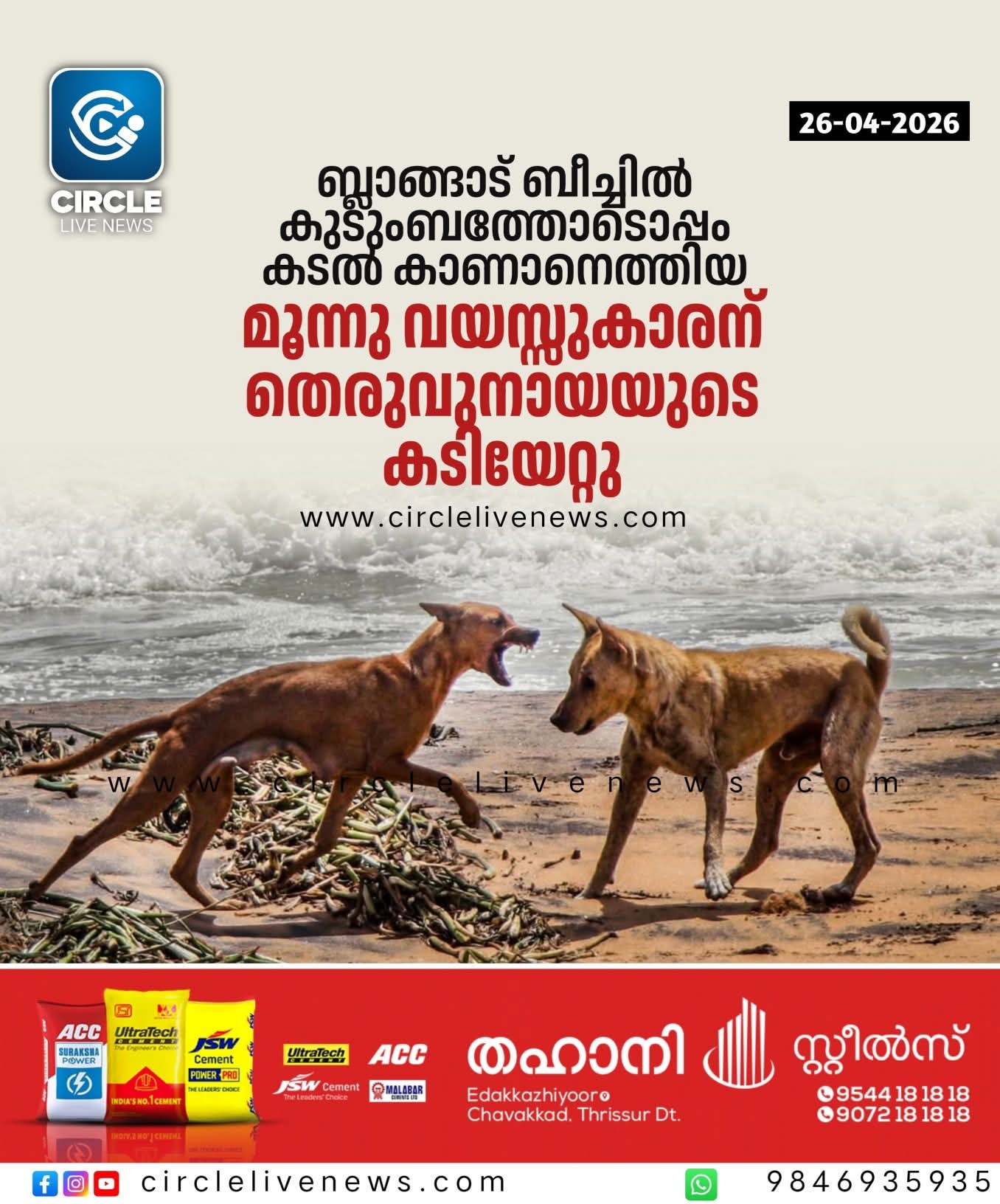 ചാവക്കാട്: ബ്ലാങ്ങാട് ബീച്ചിൽ മൂന്നു വയസ്സുകാരന് തെരുവുനായയുടെ കടിയേറ്റു. തമിഴ്നാട് ഈറോഡ് സ്വദേശി മൂന്നു വയസുള്ള അക്ഷരനാണ് നായയുടെ കടിയേറ്റത്. ഇന്ന് രാവിലെ ഒമ്പതിനാണ് സംഭവം. കടൽ കാണാൻ എത്തിയതായിരുന്നു കുടുംബം. ഇതിനിടെ അക്ഷരന് കാലിലാണ് നായയുടെ കടിയേറ്റത്. കടിയേറ്റ അക്ഷരനെ ചാവക്കാട് താലൂക്ക് ആശുപത്രിയിലും തുടർന്ന് തൃശ്ശൂർ മെഡിക്കൽ കോളേജിലേക്കും മാറ്റി.