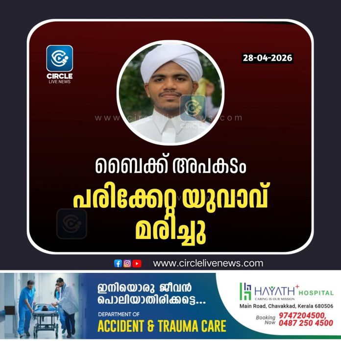 ചാവക്കാട്: ബൈക്ക് അപകടത്തിൽ പരിക്കേറ്റ് ചികിത്സയിൽ കഴിഞ്ഞിരുന്ന യുവാവ് മരിച്ചു. കടപ്പുറം തൊട്ടാപ്പ് ലൈറ്റ് ഹൗസിന് സമീപം എടശ്ശേരി ബദറുവിന്റെ മകൻ ഫഹദാ(20) ണ് മരിച്ചത്. കഴിഞ്ഞ വ്യാഴാഴ്ച രാത്രി ഏഴു മണിക്ക് മലപ്പുറത്ത് വെച്ചായിരുന്നു അപകടം നടന്നത്. മഅ്ദിൻ അക്കാദമിയിലെ വിദ്യാർത്ഥിയായ ഫഹദ് ഇതേ സ്ഥാപനത്തിലെ അധ്യാപകൻ അസ്ലം അഹസനിയുമായി സമീപത്ത് നടക്കുന്ന ഒരു ക്ലാസിൽ പങ്കെടുക്കുന്നതിന് വേണ്ടി ബൈക്കിൽ സഞ്ചരിക്കവേ ബൈക്ക് നിയന്ത്രണം വിട്ട് മതിലിൽ ഇടിച്ചാണ് അപകടം ഉണ്ടായത്. പരിക്കേറ്റ അസ്ലം അഹ്സനി അപകടം സമയം തന്നെ മരണപ്പെട്ടിരുന്നു. പരിക്കേറ്റ ഫഹദ് കോഴിക്കോട്ടെ സ്വകാര്യ ആശുപത്രിയിൽ തീവ്ര പരിചരണ വിഭാഗത്തിൽ കഴിഞ്ഞു വരികയായിരുന്നു. ഇന്ന് രാവിലെയാണ് മരണപ്പെട്ടത്.